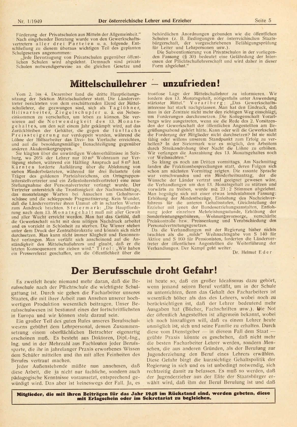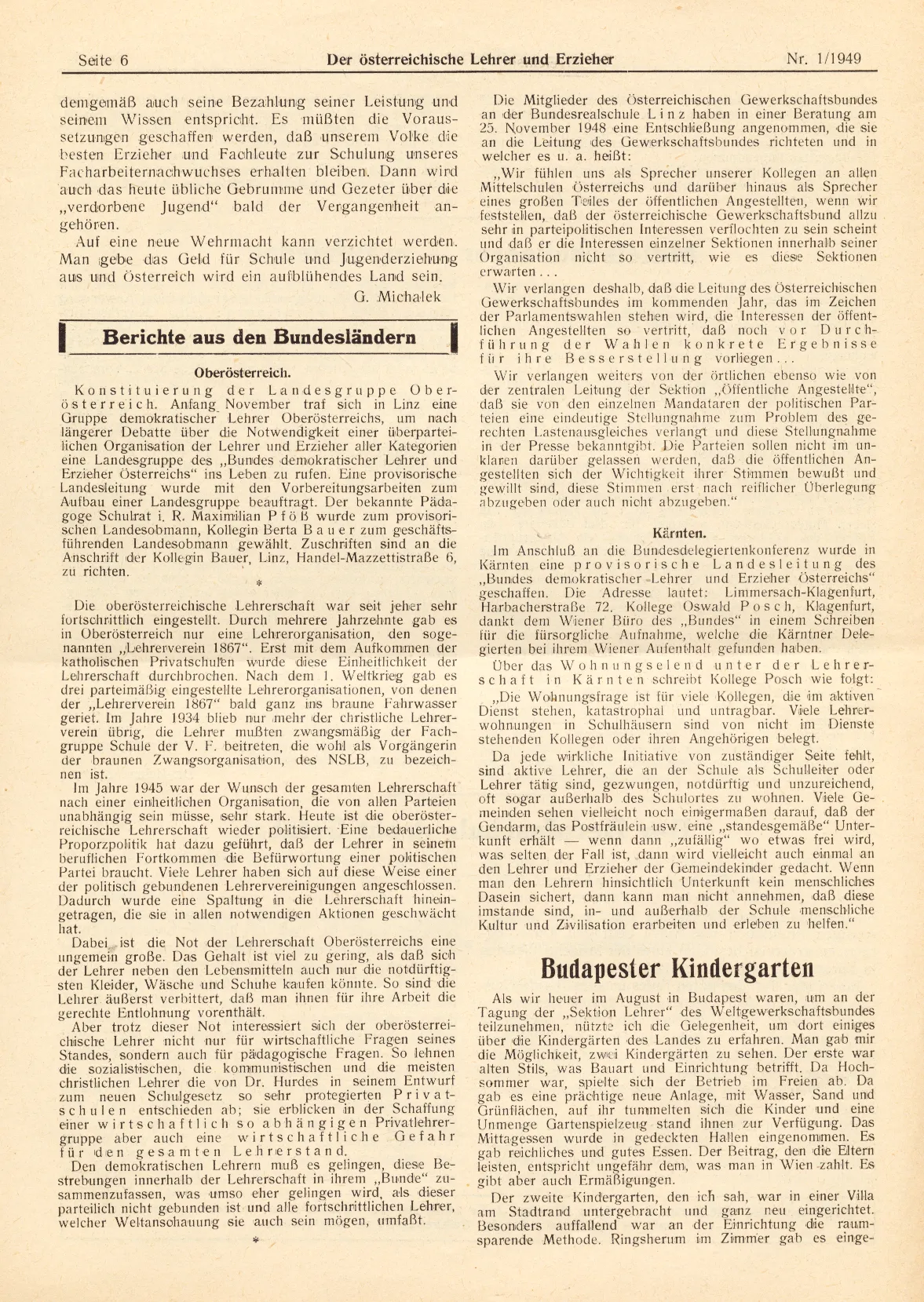 Jeder Außenstehende müßte nun annehmen, daß diese Arbeit, die ja nicht nur fachliche, sondern auch pädagogische Kenntnisse voraussetzt, entsprechend gewürdigt wird. Das aber ist keineswegs der Fall. Ja, es ist heute so, daß ein großer Idealismus dazu gehört, wenn jemand seinen Beruf verläßt, um in der Schule zu unterrichten, denn das Gehalt des Facharbeiters ist wesentlich. höher als das des Lehrers, wobei noch zu berücksichtigen ist, daß der Lehrer bedeutend mehr Ausgaben hat (Bücher, Fachschriften usw.). Wie Not der öffentlich Angestellten ist allgemein bekannt, wobei ich noch hinzufügen will, daß es einem Lehrer heute unmöglich ist, sich und seine Familie zu erhalten. Durch diese vom Dienstgeber — in diesem Fall dem Staat — geübte Praxis könnte es geschehen, daß nicht mehr die besten Facharbeiter Lehrer werden, sondern Menschen, die aus anderen Gründen, als der Berufung zur Jugenderziehung den Beruf eines Lehrers erwählen. Diese Gefahr birgt die kurzsichtige Gehaltspolitik der Regierung in sich und es ist unbedingt notwendig, sich rechtzeitig damit zu befassen. Es muß so werden, daß der Jugenderzieher aus der Elite der Staatsbürger erwählt wird, daß ihm der Beruf Berufung ist und daß demgemäß auch seine Bezahlung seiner Leistung und seinem Wissen entspricht. Es müßten die Voraussetzungen geschaffen werden, daß unserem Volke die besten Erzieher und Fachleute zur Schulung unseres Facharbeiternachwuchses erhalten bleiben. Dann wird auch das heute übliche Gebrumme und Gezeter über die „verdorbene Jugend“ bald der Vergangenheit angehören.